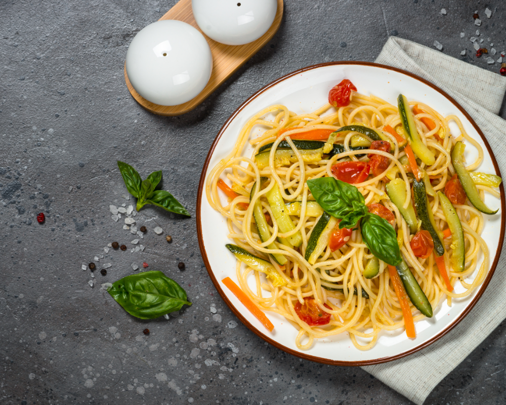 A fresh and vibrant pasta dish featuring a medley of sautéed seasonal vegetables, including bell peppers, zucchini, and cherry tomatoes, all tossed in a light olive oil and garlic sauce. It’s a healthy and colorful option for anyone looking to enjoy the flavors of fresh produce.