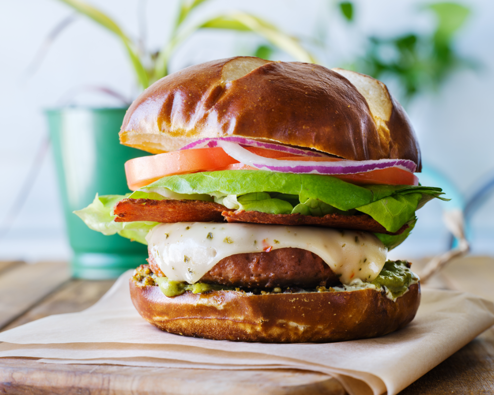 A hearty and flavorful plant-based patty made with beans, grains, and fresh vegetables, served on a soft, toasted bun. With crisp lettuce, tomatoes, and a creamy vegan sauce, this burger offers a satisfying bite for those looking for a meatless option.